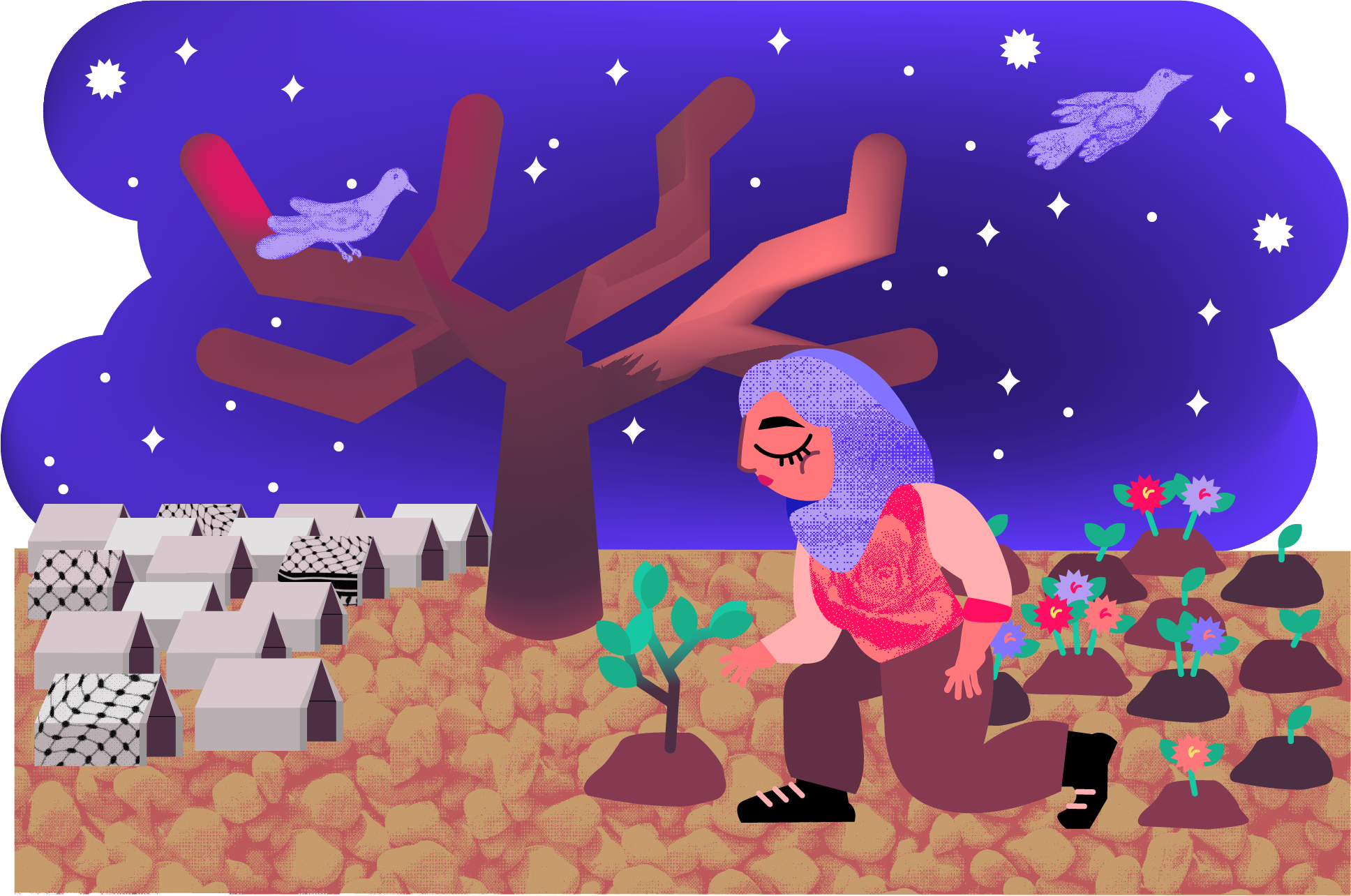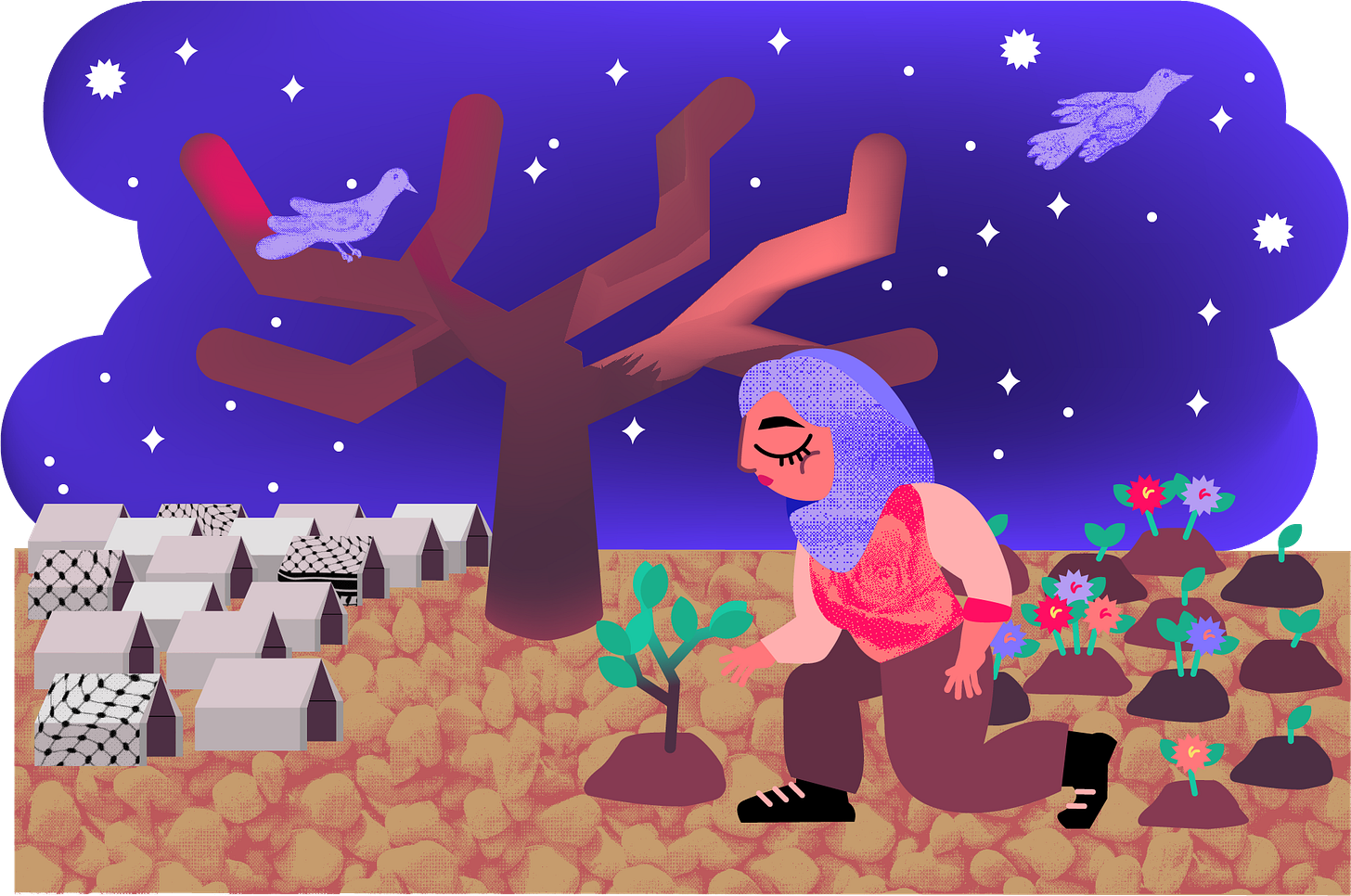 L’ambivalenza tra il dolore e la speranza aperti da queste forme di resistenza riproduttiva è rispecchiata da chi, come Hala Shoman, si trova nella contraddizione di voler esprimere la preoccupazione per i rischi corsi da madri e bambinə, ma, allo stesso tempo, di non voler ricalcare la logica del genocidio riproduttivo. Tuttavia, ricorda Shoman, e ancora una volta Najib in versi, la risposta alla violenza del genocidio riproduttivo non si limita al fisico riprodursi, ma comprende tutte le pratiche che rendono la vita possibile. Pratiche di cura, di coltivazione della memoria, di trasmissione delle molte lingue in cui la resistenza può esprimersi: